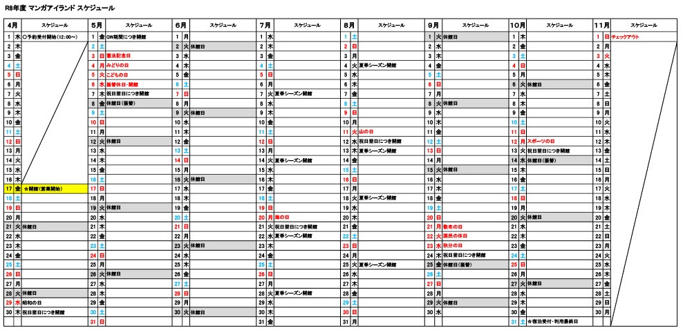 (注1) 夏休み期間中の7月、8月は休まず営業します。また、4月29日から5月7日までの期間、9月21日、9月22日、10月12日も宿泊可能です。