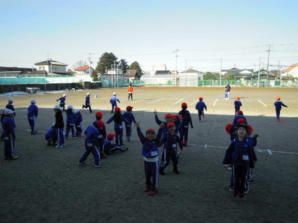 1年1組と4組が校庭で体育の学習中。ミニハードルを元気に跳んでいました。