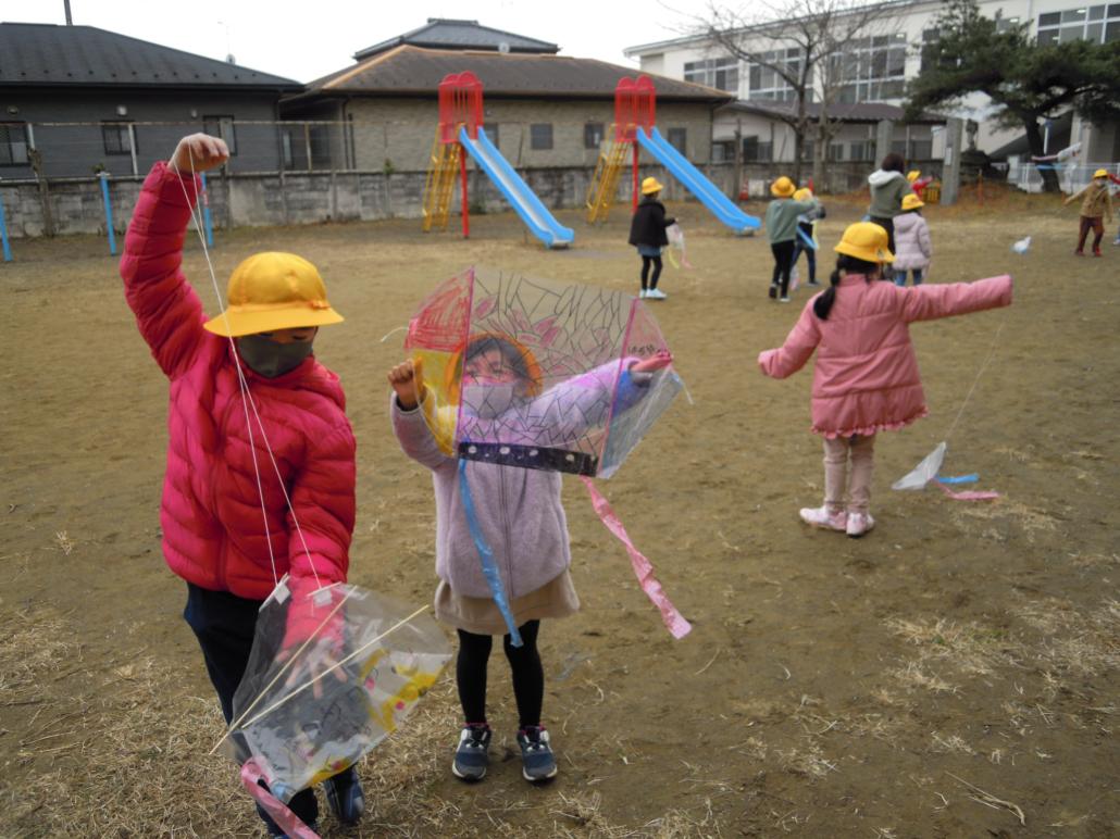 1年生が前庭でたこ揚げをしていました。生活科の学習として、自分で作ったたこを揚げて