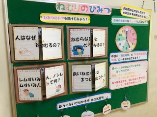 スマホやゲーム、楽しいことに夢中でついつい夜更かししてしまうことは大人でもあります。睡眠をしっかりとることは、とても大切です。養護の先生が興味深い掲示物を作ってくれました。