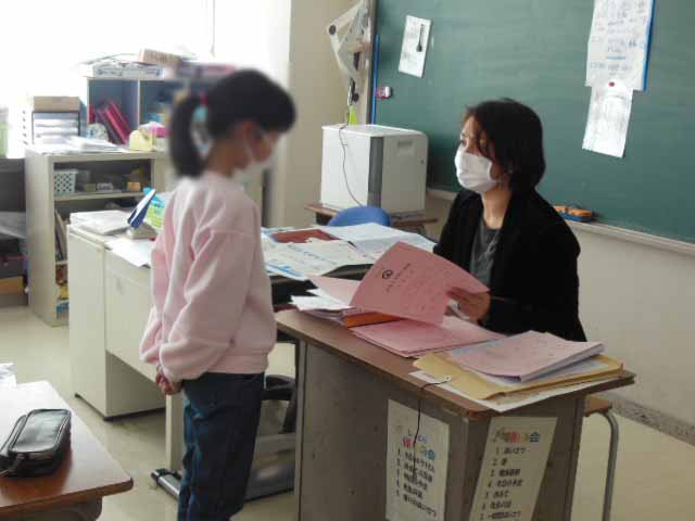 教室では,担任の先生と冬休みの過ごし方についての確認や2学期の振り返りをしました。その後,子供たち一人一人に担任の先生から通信表が渡されました。担任の先生から頑張ったこと等,一言添えられて通信表が手渡され,子供たちはとても嬉しそうでした。