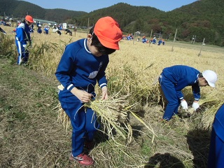 5・6年生が稲を刈り,3・4年生が稲を結び,1・2年生が稲運ぶという流れで行われました。みんな一生懸命に自分の割り当てられた仕事に取り組んでいました。
