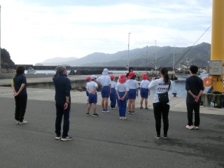 はじめに、大原小学校の児童に「ようこそ寄磯漁港へ。」と歓迎の言葉を